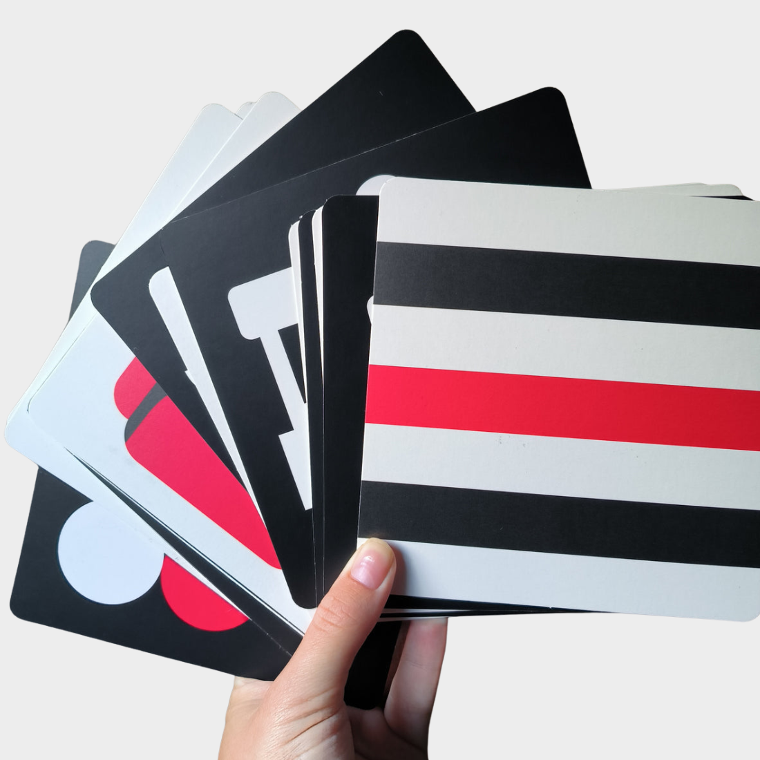 De kaarten met zwart-wit-rood zijn voor kindjes van 3-6 maanden. De set bevat 20 kaarten die aan beide zijden bedrukt zijn. 40 verschillende plaatjes dus! Gegarandeerd urenlang plezier 🤗